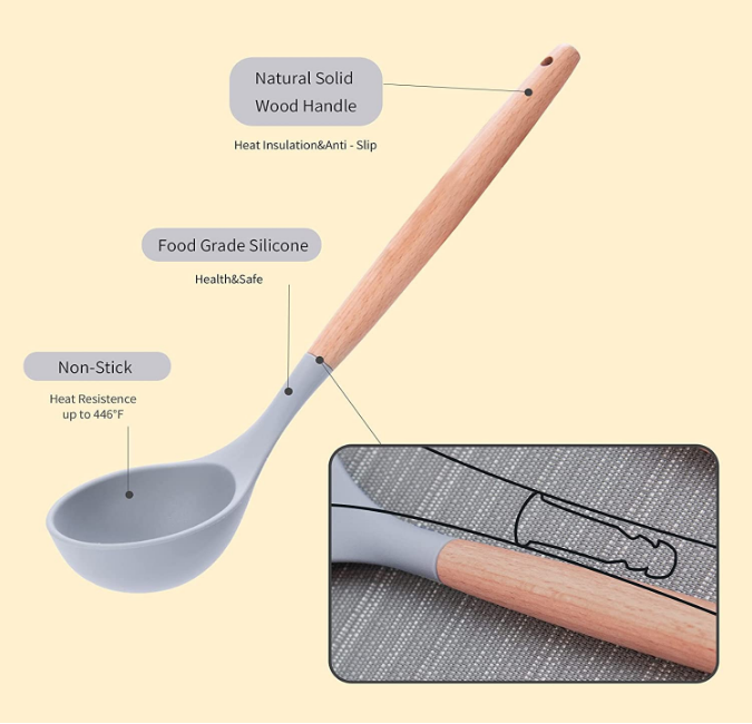 Wooden Handle,Heat Resistant Silicone kitchen Utensils set 11 Pcs Gray